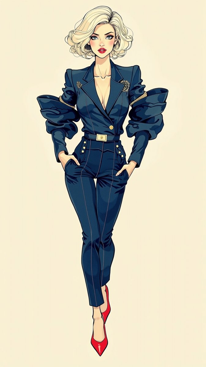 ink drawing, illustration, naive art, doodling, zentagle, folk art, cartoonish, paper cut gouache illustration, minimalism A captivating model with luscious platinum blonde hair styled in a puffed bob and vibrant red lips struts confidently in a fitted navy pantsuit that melds the artistry of Vivienne Westwood's tailored designs with Giorgio Armani's sleek aesthetics. The structured blazer is embellished with asymmetrical details, while the tailored trousers elongate her long legs, paired with striking red stilettos that pop. Her confident expression and dynamic pose radiate empowerment and self-assuredness, completing a modern and stylish lo...