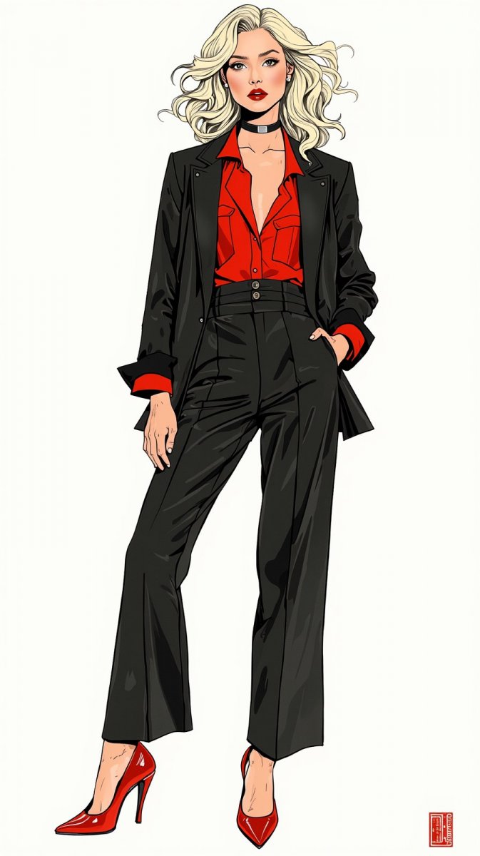 Элегантный портрет современной иконы стиля, воплощенной в изысканном черном брючном костюме. Изображение сочетает в себе безупречную классику, навеянную эстетикой Тома Форда, с бунтарским духом Вивьен Вествуд, создавая уникальный визуальный образ. Модель с роскошными платиновыми локонами и ярко-красной помадой демонстрирует уверенность и смелость, подчеркнутые высокой посадкой брюк, зрительно удлиняющих ноги, и дерзкими алыми каблуками. Минималистичный фон акцентирует внимание на ее выразительной внешности и сильной харизме, передавая ощущение мощной женственности и непоколебимой уверенности в себе. Рисунок выполнен в технике наивного искусства с элементами doodle, zentangle и фольклорного стиля, что придает ему особый шарм и индивидуальность. Используются техники иллюстрации, напоминающие вырезку из бумаги и гуашевую живопись, а также элементы минимализма для создания гармоничного и лаконичного образа. Это яркая интерпретация моды и красоты, воплощенная в стильной и запоминающейся графической работе, сочетающей в себе современный гламур и художественную самобытность