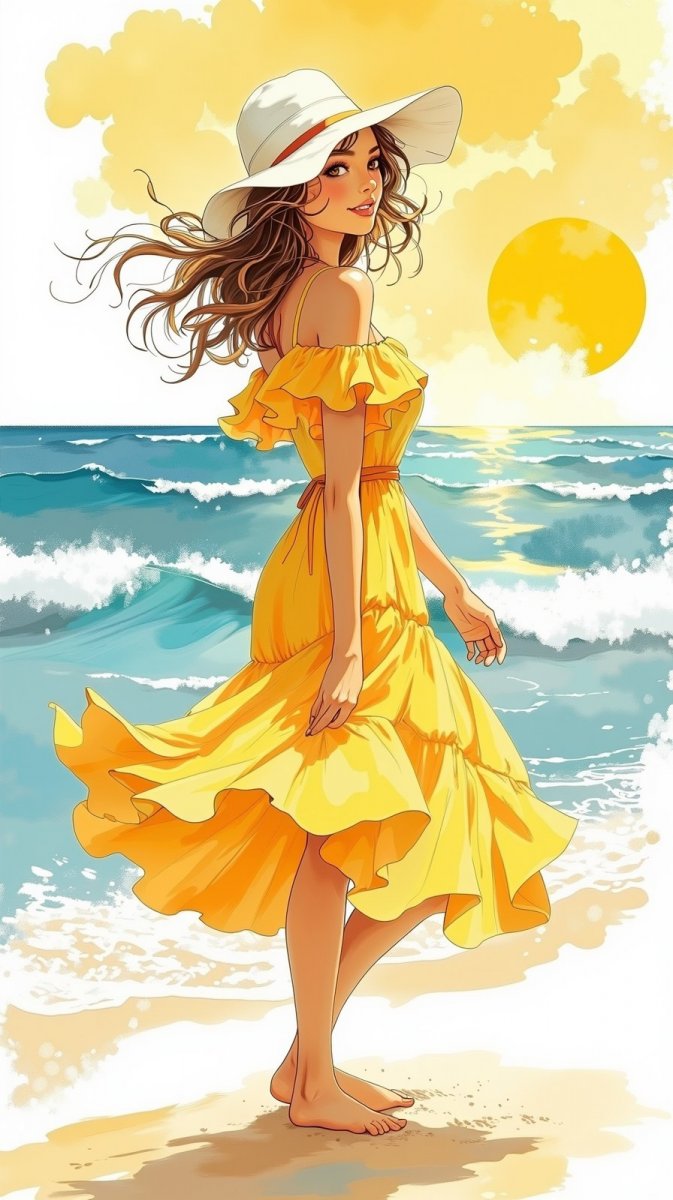 doodling, young woman standing in a flowy yellow sundress with ruffled sleeves, white wide-brimmed hat, curly hair blowing in the wind, barefoot on sandy beach, looking playfully at camera, bg is abstract waves and sun.