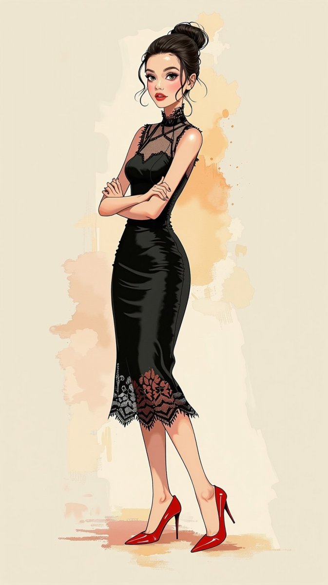 illustration, young woman in a fitted black dress with intricate lace details, high neckline, paired with red stiletto heels, hair in a sleek bun, posing confidently with arms crossed, bg is elegant with smooth gradient colors.