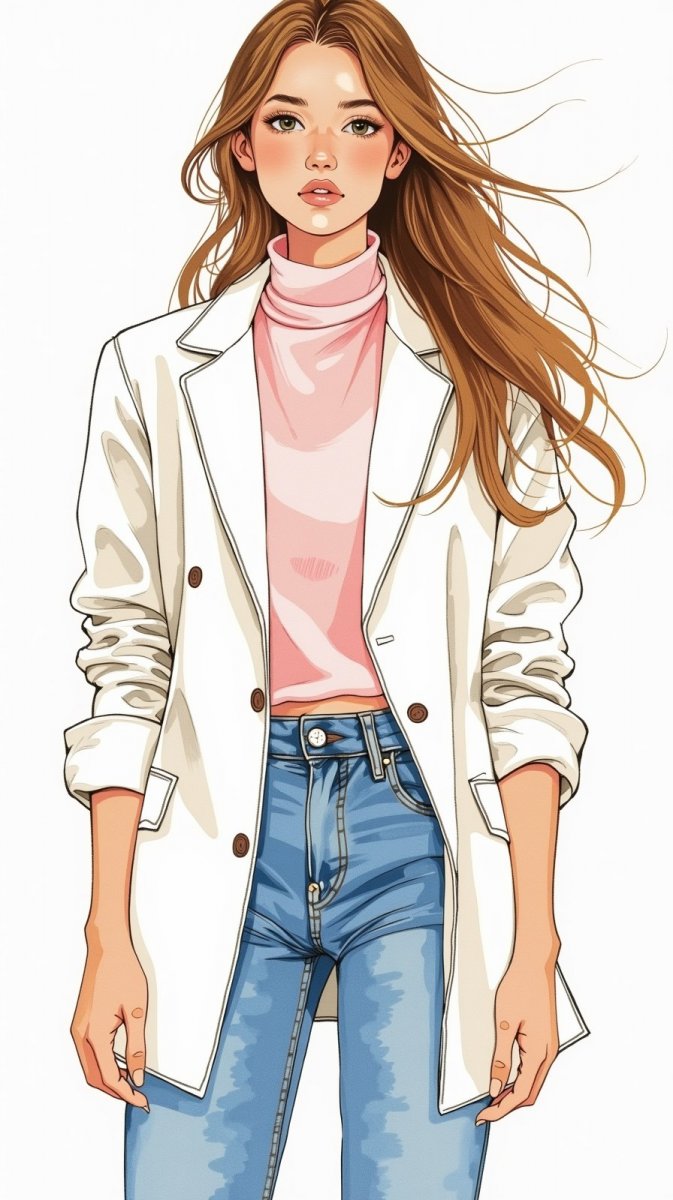 ink drawing, young woman wearing oversized white blazer, pastel pink turtleneck sweater underneath, high-waisted straight-leg jeans, long brown hair cascading down shoulders, standing in a relaxed pose, hands hanging at sides, bg is plain gray.