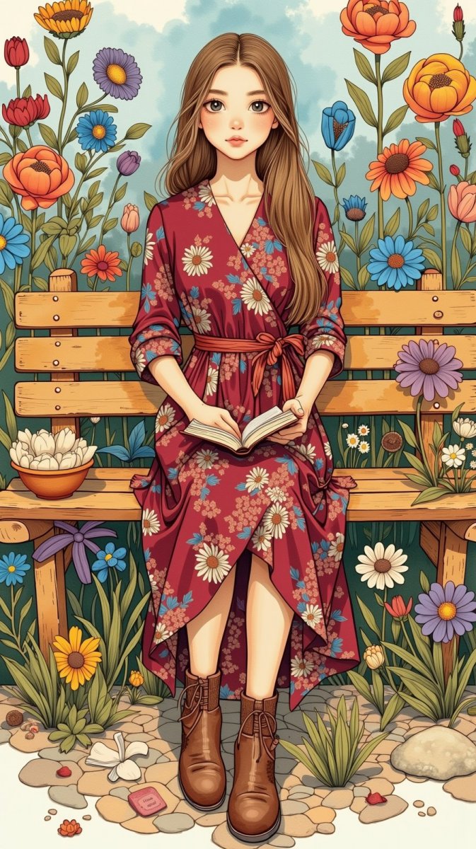 folk art, young woman wearing maroon wrap dress adorned with floral patterns, cinched at the waist, brown ankle boots, long straight hair, sitting on wooden bench with a book in hand, bg is whimsical garden scene filled with colorful blooms.
