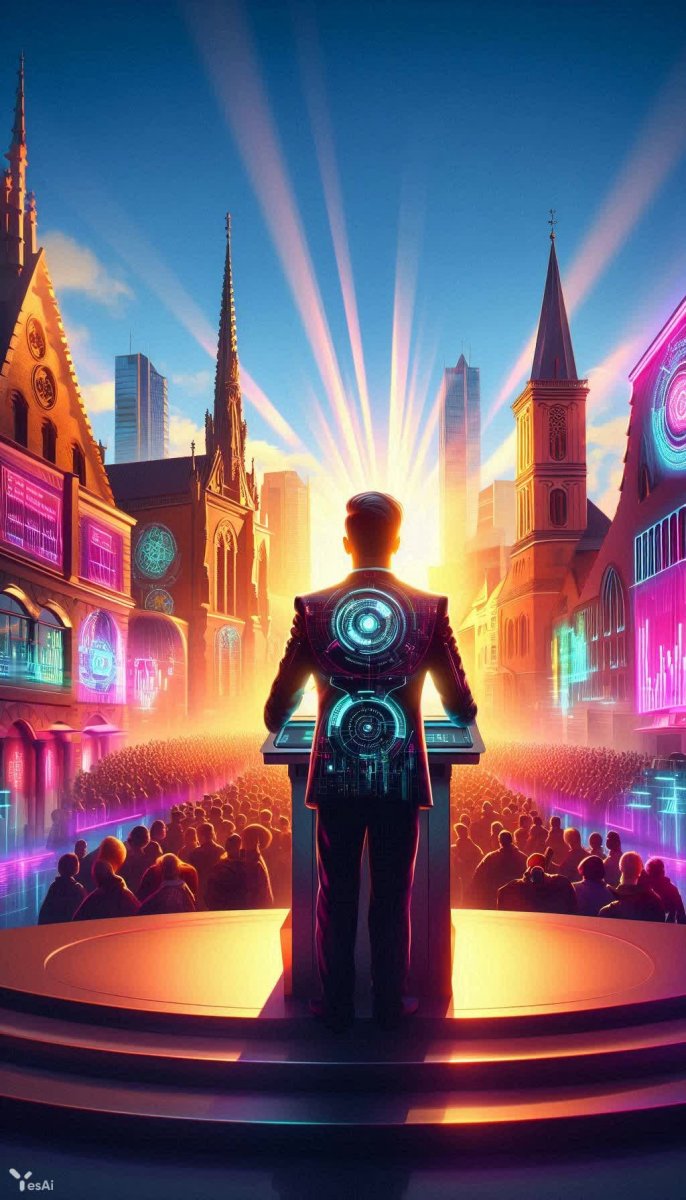 Представьте себе антиутопический мегаполис будущего, где древняя архитектура переплетается с футуристическими небоскребами. Рассвет едва пробивается сквозь плотную дымку, окутывающую улицы, наполненные бурлящей толпой. В центре внимания - оратор, выступающий перед огромной аудиторией, залитый мягким светом, словно ангел в этом хаотичном мире. Его формальный костюм с элементами киберпанка подчеркивает контраст между классическим стилем и технологичным будущим. Вокруг развеваются баннеры с лозунгами, отражающие дух времени. Взгляд скользит по детализированным фасадам зданий - от величественных католических соборов, словно перенесенных из XVI века, до ультрасовременных бизнес-центров, пронзающих небо своими острыми шпилями. Отражения света играют на стеклянных поверхностях, создавая причудливый калейдоскоп бликов. Утренний туман окутывает улицы, смягчая яркие краски и придавая всему происходящему ощущение нереальности. Это цифровое произведение искусства, выполненное профессиональными красками, поражает своей детализацией и вниманием к текстурам. Каждый оттенок тщательно подобран, чтобы создать неповторимую атмосферу киберпанка - мир, где технологии и традиции сталкиваются в захватывающем танце. Здесь переплетаются надежда и отчаяние, прогресс и упадок, создавая уникальный визуальный опыт. Это не просто изображение – это окно в альтернативную реальность, где прошлое и будущее слились воедино. Этот мир полон загадок и тайн, ожидающих своего открытия