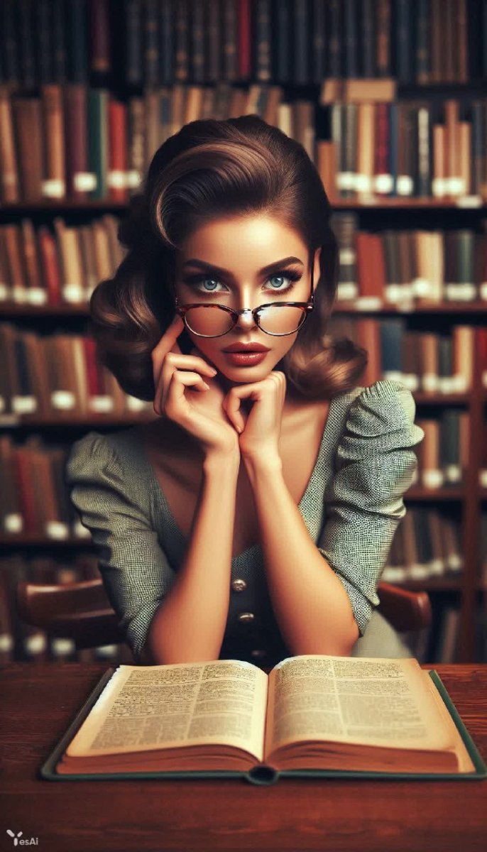 A lady with a well-groomed hairstyle is reading a book in the library, a reproachful look at us, which seems to distract from an important matter, glasses on the bridge of a cute nose, retro, pin-up style, 1960s, amazing style from Zoe Mozert