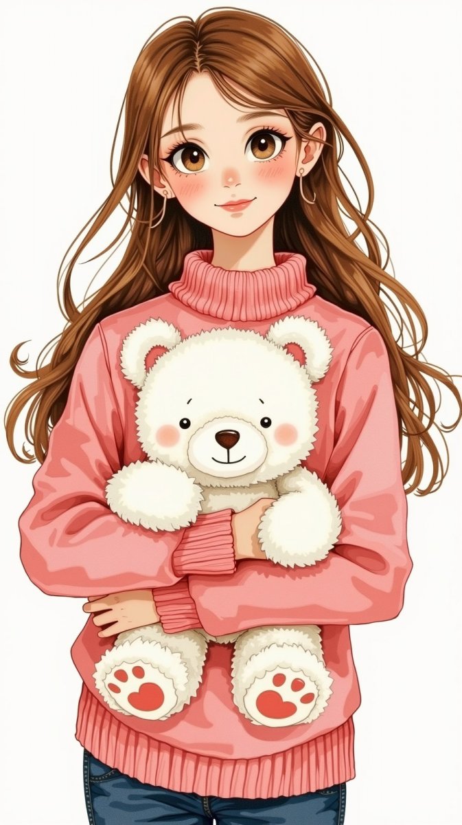 Иллюстрация в стиле наивного искусства, выполненная в технике гоше и напоминающая бумажный силуэт. На изображении представлена кукла с длинными каштановыми волосами, одетая в розовый свитер с круглым вырезом. Кукла держит в руках белого плюшевого мишку, что придает ей очаровательный и беззаботный вид. Ее выражение лица излучает радость и веселье. Фон изображения выполнен в чисто белом цвете, что позволяет выделить детали куклы и игрушки, создавая ощущение легкости и воздушности. Стиль иллюстрации характеризуется упрощенными формами, яркими, насыщенными цветами и плоскими текстурами, типичными для техники гоше. Работа выполнена с любовью к деталям, передает теплоту и душевность, вызывая ностальгические чувства и ассоциируясь с детством и безмятежностью. Яркие акценты розового цвета в одежде куклы гармонично сочетаются с нейтральным фоном, создавая визуально приятную композицию. Использование бумажных силуэтов добавляет изображению оригинальности и подчеркивает его художественную ценность, делая его привлекательным для широкой аудитории. Это прекрасный пример современного иллюстративного искусства, вдохновленного классическими техниками и стилями