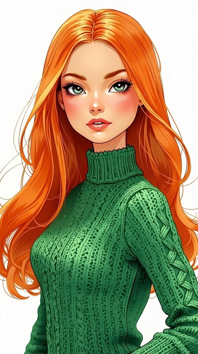 zentagle illustration of barbie doll with long straight red hair, green sweater with cable knit pattern, serious expression, looking directly at camera, bg is white.