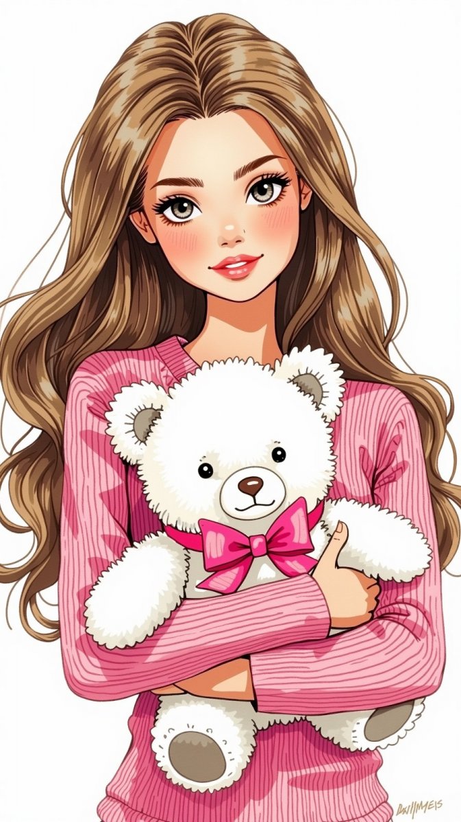 #1. ink drawing of barbie doll wearing pink sweater with round neckline and long sleeves, holding white teddy bear with pink ribbon around its neck, long brown hair styled in waves, looking gently at the viewer, bg is white #role_doll