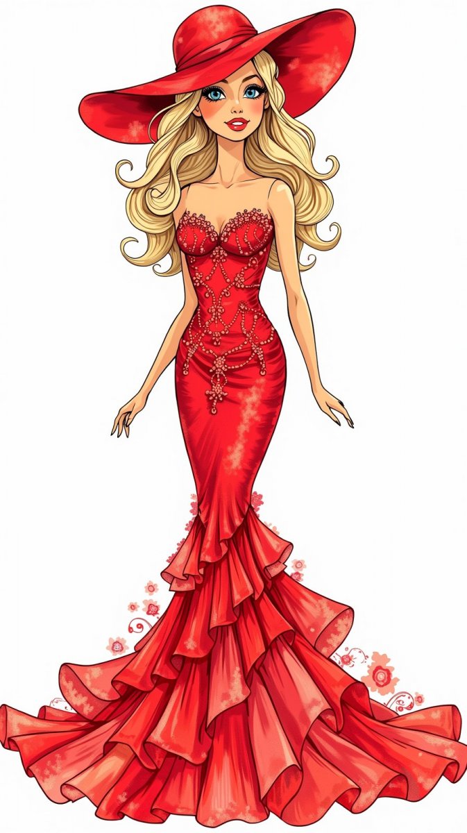 #5. zentangle art of barbie doll wearing a glamorous long red dress with mermaid silhouette, large hat with a wide brim, blonde hair styled in loose curls, poised elegantly, bg is white #role_doll