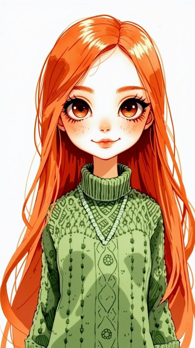 #4. doodling of doll with long straight red hair cascading over shoulders, dressed in a green cable knit sweater, dark eyeliner accentuating large eyes, slight smile on her face, bg is white #role_doll