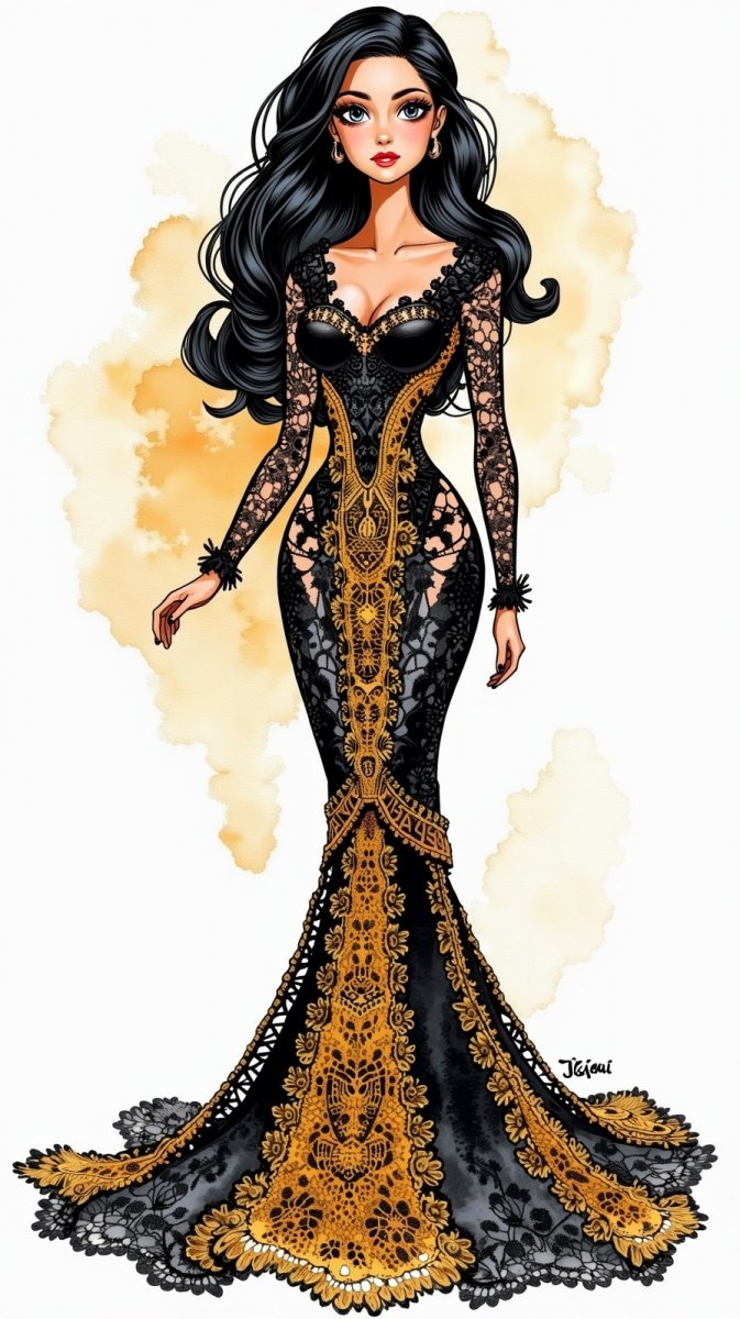 #3. doodling of barbie doll dressed in black and gold crochet gown with flowing skirt, long black hair styled in waves, serious expression, bodice embellished with intricate patterns, bg is white #role_doll