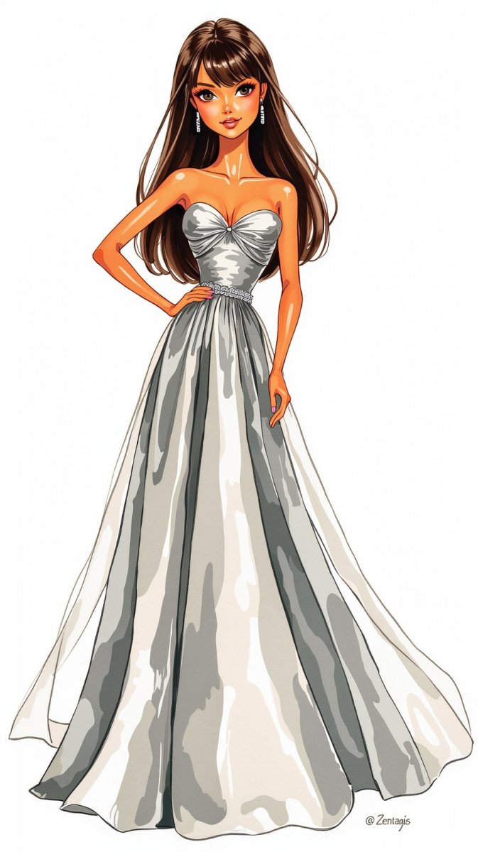 #5. zentagle-inspired illustration of barbie doll wearing silver dress with full skirt and sweetheart neckline, long straight hair with bangs, striking a pose with a confident expression, bg is white #role_doll