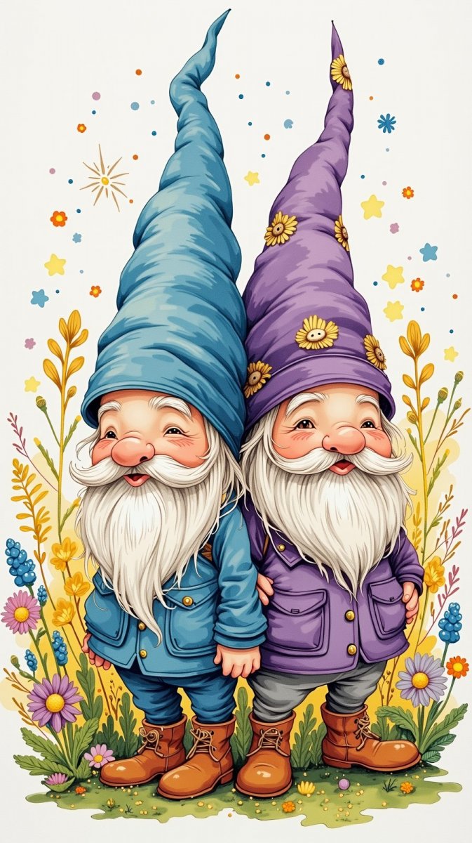 Два забавных гнома в ярких нарядах красуются на красочной иллюстрации выполненной в технике паперкат и гуаши. Один гном одет в голубой костюм с серебряной шляпой, а второй – в пурпурный наряд с золотыми акцентами. Они стоят спиной к спине демонстрируя свои непохожие друг на друга стильные образы и лучезарные улыбки. Иллюстрация создает ощущение легкости и игривости благодаря преувеличенно мультяшному стилю и тщательно проработанным деталям. За гномами простирается красочный сад, полный ярких цветов и зелени, что подчеркивает сказочную атмосферу произведения. Это настоящее произведение искусства, которое может стать прекрасным украшением детской комнаты или оригинальным подарком для любителей волшебных существ и необычных иллюстраций. Яркие цвета и милые персонажи не оставят равнодушным ни одного ребенка, а взрослым напомнят о беззаботном детстве и радости простых вещей. Идеально подойдет для оформления тематических вечеринок или создания уникальных открыток и приглашений. Каждая деталь продумана до мелочей, что делает эту иллюстрацию по-настоящему особенной и запоминающейся. Это настоящее воплощение фантазии и креативности художника