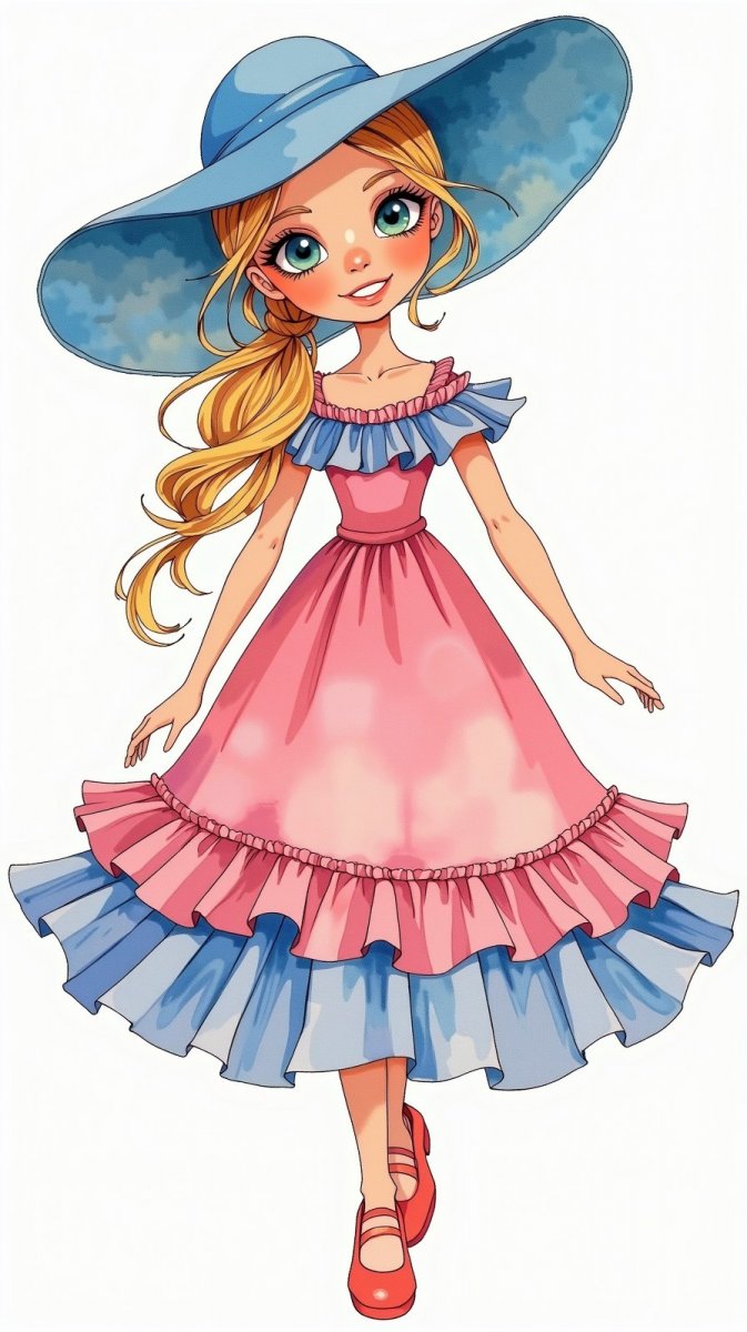 #4. folk art rendering of doll in pink and blue ruffled dress, blonde hair styled in a high ponytail, large blue hat with wide brim, looking playfully at the viewer, bg is white #role_doll