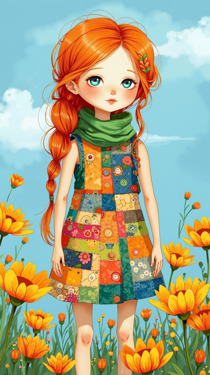 #5. folk art illustration of a doll with colorful patchwork dress, featuring oversized buttons and a green scarf, bright orange braided hair, standing in a field of flowers under a clear blue sky. #role_toys
