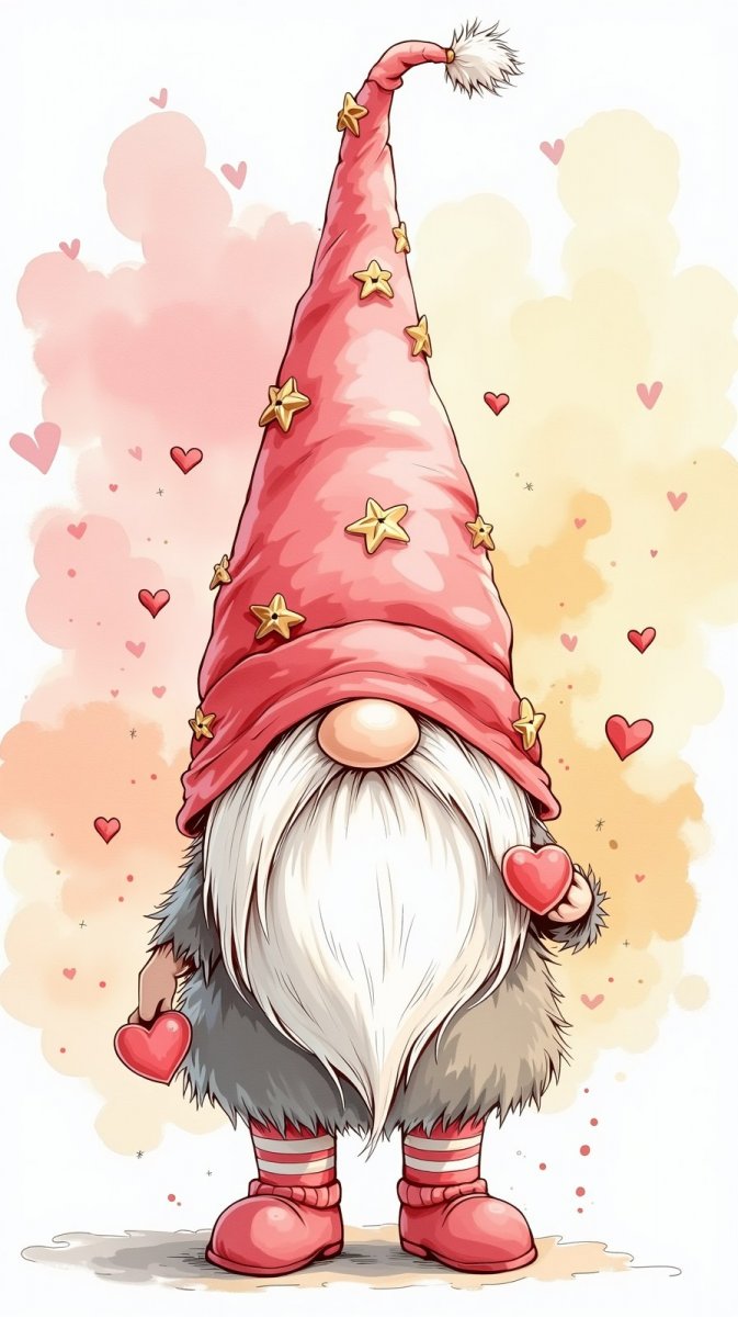 #1. ink drawing of small gnome figurine with pink cone-shaped hat decorated with gold stars, white beard, and soft fuzzy body, wearing striped socks and holding a small heart-shaped ornament, BG is soft pastel colors #role_toys