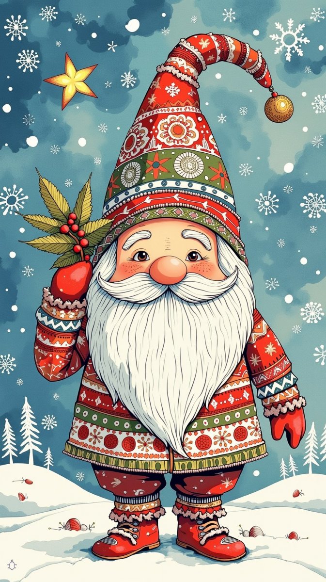 #4. zentangle art of a festive gnome with a large round nose, long beard, and a pointed hat filled with decorative patterns, holding a golden star and wearing traditional holiday attire, BG is a charming winter scene with snowflakes #role_toys