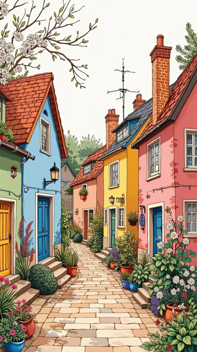 #3. doodling of a cozy street lined with colorful cottages and blooming plants, infused with detailed textures and bold outlines, inspired by naive art traditions that evoke feelings of happiness #role_houses