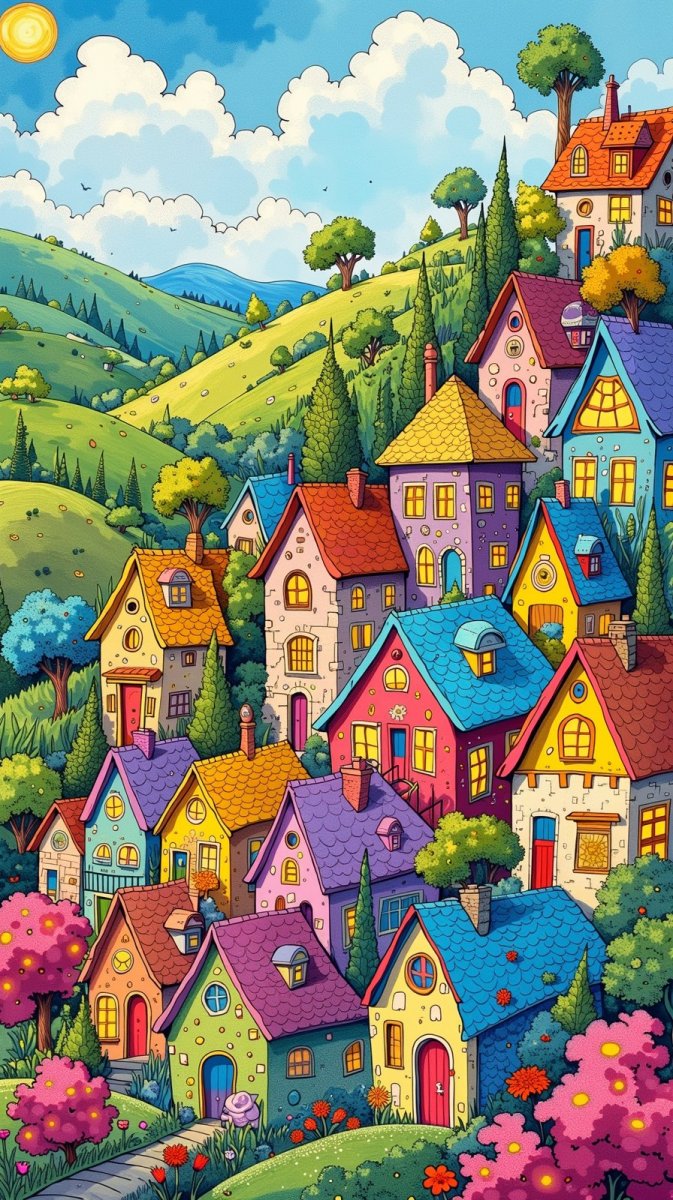 #5. zentagle-inspired artwork of a magical village perched on rolling hills, filled with fun-shaped homes and cartoon trees, painted in a kaleidoscope of colors that radiate joy and creativity #role_houses