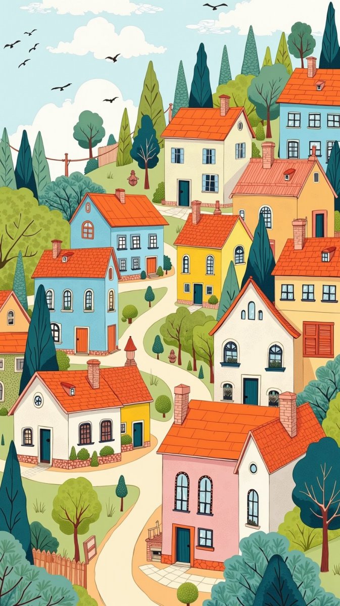 flux Очаровательная деревня: сказочный мир ярких иллюстраций и домов. Картинка из нейросети Flux 1