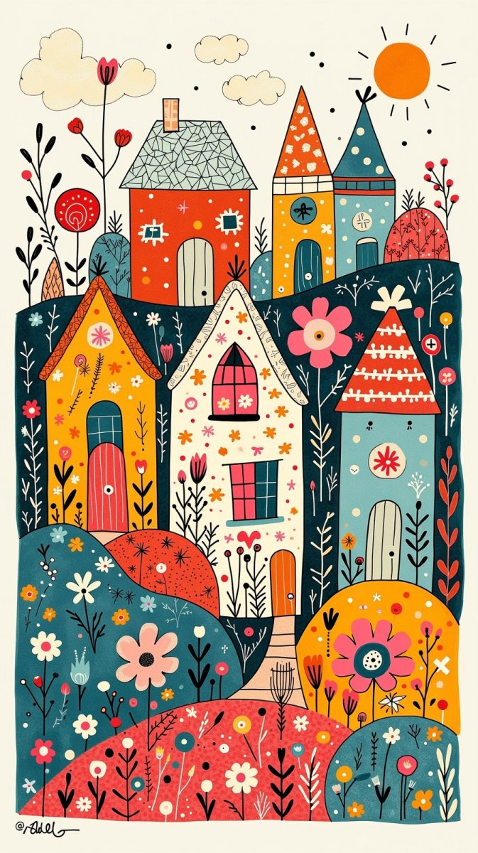 #1. ink drawing of colorful whimsical houses on a hillside with playful patterns and vibrant flowers, creating a cheerful folk art scene filled with joy and warmth #role_houses