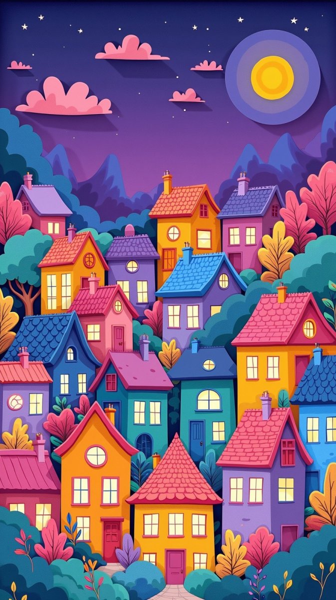 #5. paper cut gouache illustration of an adorable cityscape with colorful cartoon houses and a purple sky at night, inviting feelings of wonder and creativity #role_houses