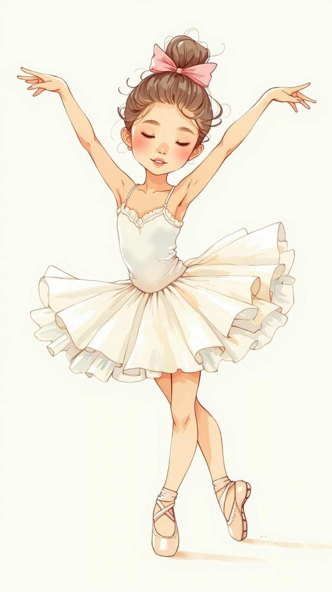 #1. ink drawing of young ballerina in white tutu and pointe shoes, in graceful pose with arms stretched out to sides and eyes closed, serene expression on her face, hair styled in elegant bun with pink ribbon, BG is plain white #role_dance