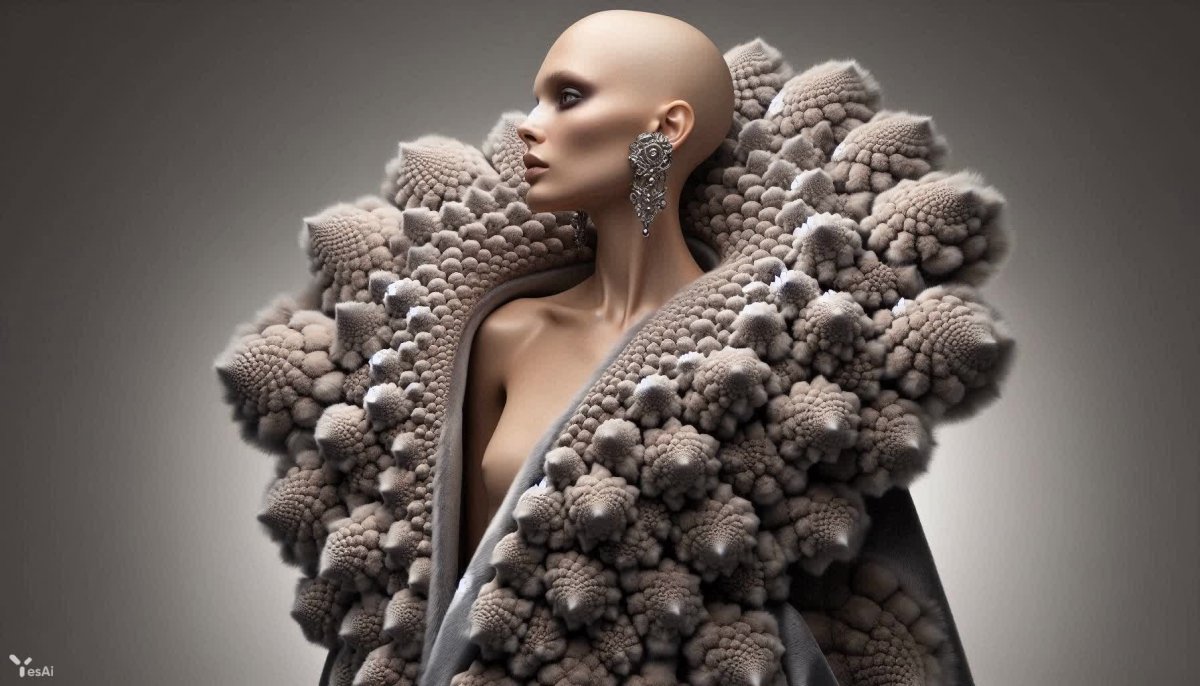Перед зрителем предстает завораживающий образ – молодая, статная женщина с лишенной волос головой, воплощенная в необычной и динамичной позе. Её фигура, обрезанная до середины бедра, создает ощущение фрагментарности, загадочности и подчеркивает акцент на деталях костюма и выражении лица. В центре внимания – роскошная туника, выполненная в уникальном стиле бохо-шик с элементами высокой моды и сюрреализма. Она словно соткана из хаотичных, но гармонично сочетающихся элементов: гигантская фрактальная чешуя, напоминающая переплетение сложных узоров, и мягкий мех серобежевой норки, создающие контраст текстур и цветов. Туника асимметрична, обнажая одно плечо, что добавляет образу дерзости и свободы. Её дополняют массивные серьги из огромных жемчужин, которые сверкают в полумраке серого градиентного фона. Их внушительные размеры привлекают внимание к лицу и подчеркивают загадочность и хрупкость образа. Вся композиция пронизана атмосферой сюрреализма и хоррора, создавая ощущение нереальности происходящего. Это не просто портрет – это визуальная поэзия, сочетающая в себе красоту, таинственность и легкий намек на неизведанное. Кажется, будто перед нами обитательница другого мира, чья внешняя хрупкость скрывает глубокую внутреннюю силу и загадочный опыт. Этот образ завораживает своей необычностью, вызывая смешанные чувства восхищения и тревоги