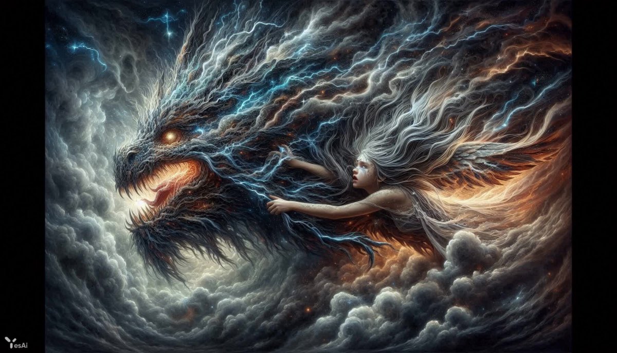 Сюрреалистичная картина: девушка-сильфида с развевающимися как дым волосами отчаянно цепляется за спину дракона, сотканного из грозовых туч и теней. Вместо чешуи — мерцающие осколки ночного неба и пожирающие друг друга тени. Её лицо искажено экстазом и страхом, а из глаз струятся звёздные следы. Их полет сквозь хаотичный вихрь из света и тьмы, стиль Грега Рутковски и Здзислава Бексиньского. Энергичные мазки, интенсивные цвета, вихревая композиция.