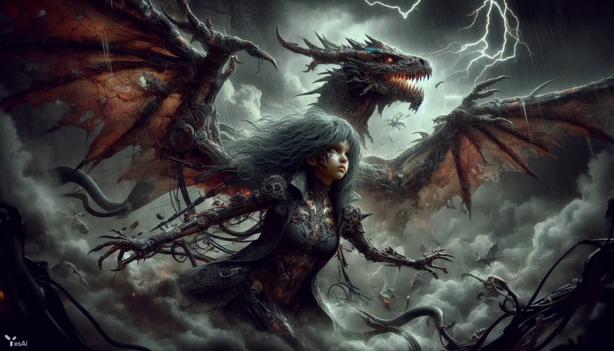 Драконья кожа: девушка в объятиях кошмарной бури - Пример изображения, сгенерированного нейросетью Dalle 3