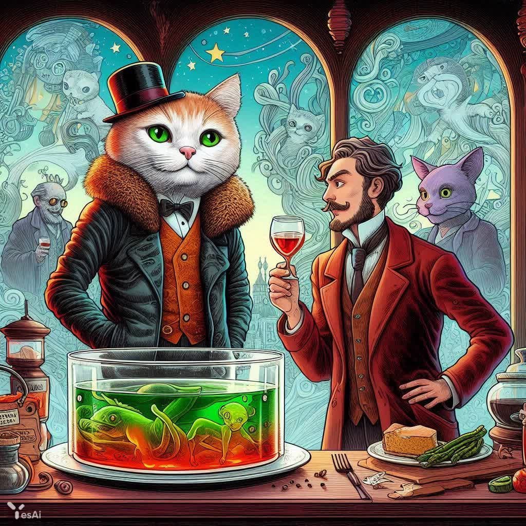 Необычайное столкновение эпох и характеров, запечатленное в сюрреалистическом видении. Перед зрителем предстает причудливая картина: Ленин, воплощенный в образе элегантного кота в строгом пиджаке, оказывается в компании весьма сомнительных личностей – человека с явными признаками алкогольной зависимости и блюда, традиционно ассоциирующегося с застольями и праздниками. Этот странный квартет собрался воедино на фоне запотевшего стекла вытрезвителя, где причудливые рисунки добавляют происходящему атмосферу таинственности и нереальности. Композиция вызывает множество вопросов и интерпретаций. Символизирует ли это столкновение идеологии и человеческой слабости? Или же это сатирический взгляд на исторические события, переосмысленные через призму абсурда? Возможно, перед нами метафора о противоречивости революции, сочетающей в себе стремление к высоким идеалам и неизбежные пороки человеческой природы. Изображение пронизано сюрреалистическим настроением, где реальность смешивается с фантазией, а привычные образы приобретают новые, неожиданные значения. Кот-Ленин, алкаш и холодец – эта абсурдная компания создает ощущение дежавю, заставляя задуматься о хрупкости человеческого существования и относительности истины. Картина приглашает зрителя к размышлениям о роли личности в истории, о цене прогресса и о вечной борьбе между добром и злом. Запотевшее стекло вытрезвителя словно отделяет этот странный мир от реальности, подчеркивая его эфемерность и недолговечность. Это произведение искусства – своеобразное зеркало, отражающее наши собственные страхи, надежды и сомнения
