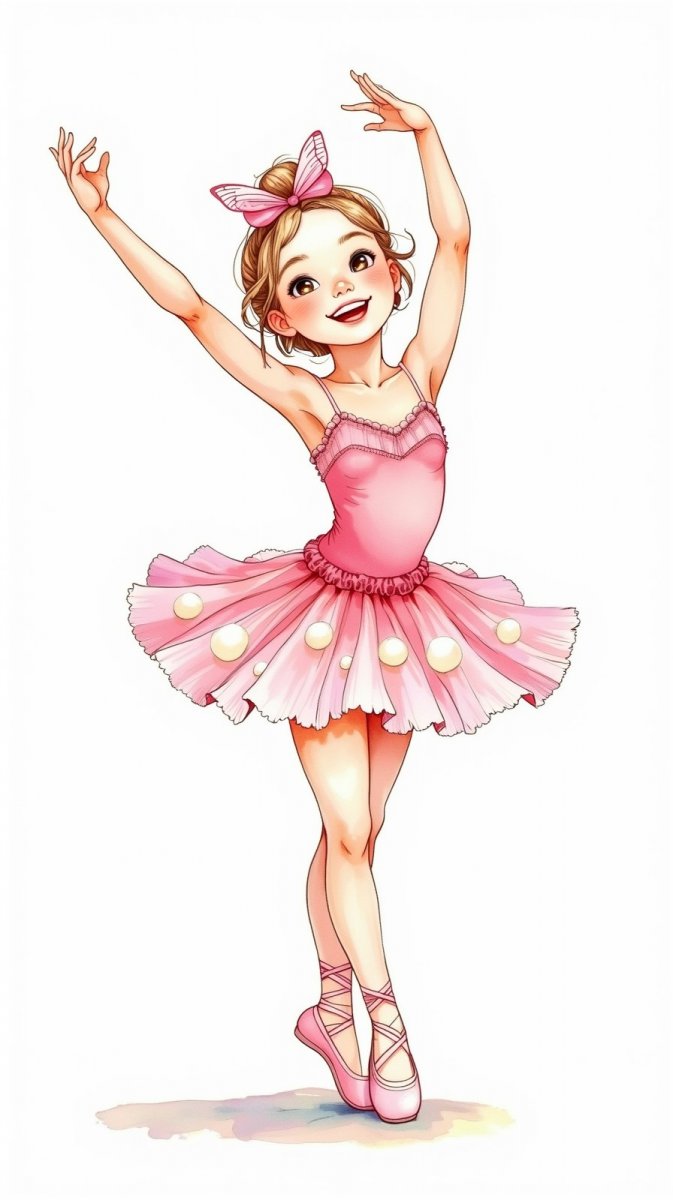#5. folk art illustration of young ballerina in pink tutu and pointe shoes, arms zig-zagged above head and legs playfully posed, with butterfly hair accessory, cheerful grin on face, BG is white #role_dance
