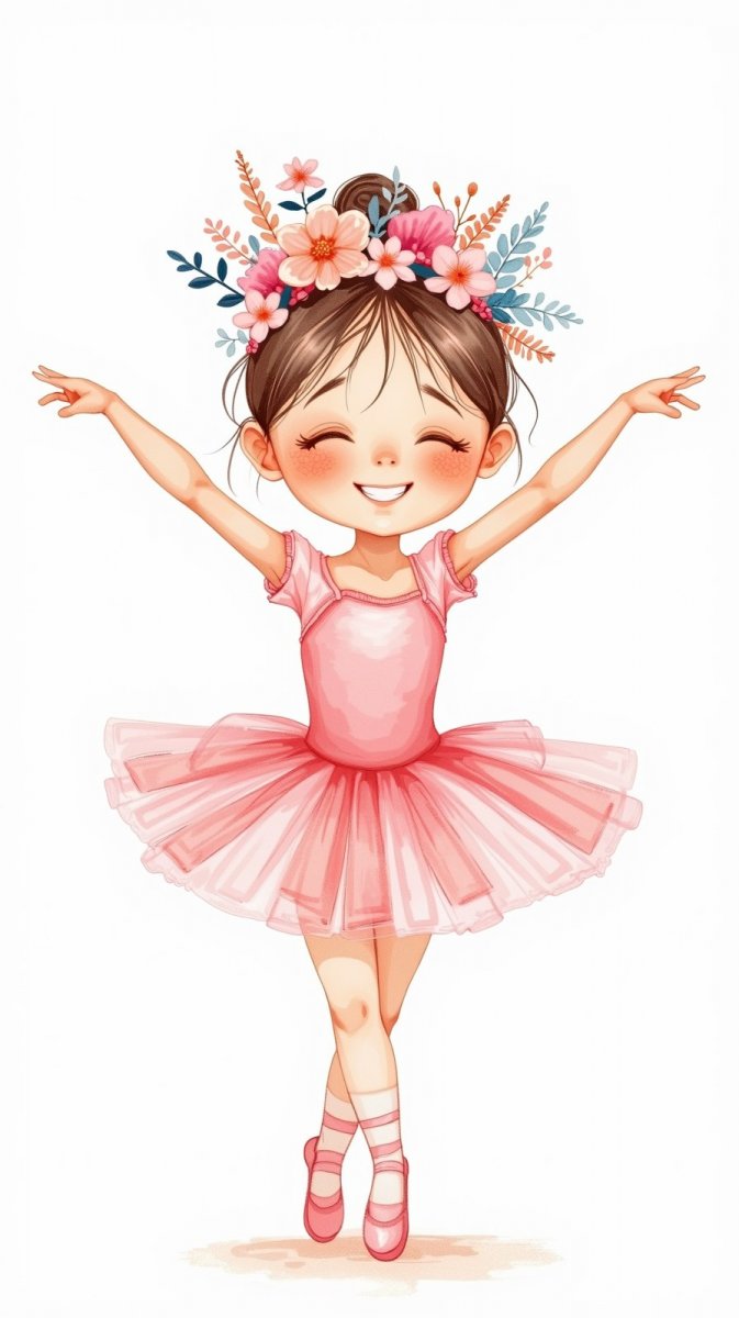 #2. cartoonish illustration of young ballerina in pink tutu, standing on one leg with arms outstretched, wearing a crown made of flowers, head slightly tilted, big smile, BG is white #role_dance