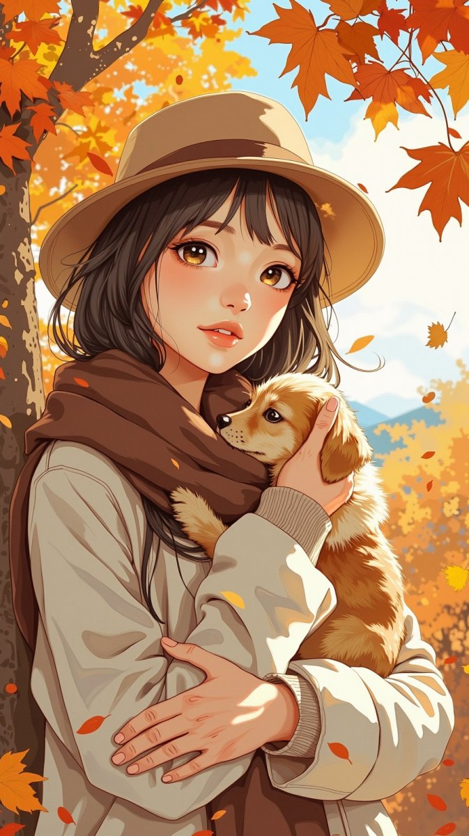 #4. спокойный осенний вечер, девушка в мягком свитере: шоколадный шарф, светлая куртка, уютный пейзаж с падающими листьями, домашний питомец на руках, аккуратный маникюр, натуральный макияж, атмосфера тепла и нежности, двойная экспозиция #role_autumn