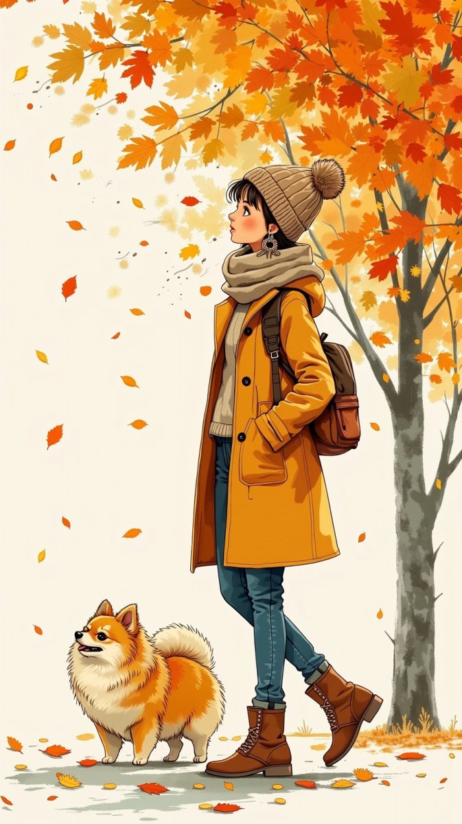 #5. осенние прогулки в парке, девушка в свободном стиле: уютное пальто и вязаная шапка, джинсы, минималистичные серьги, рядом с ней мягкий шпиц, проходящие падающие листья, светлая и тёплая атмосфера, двойная экспозиция #role_autumn