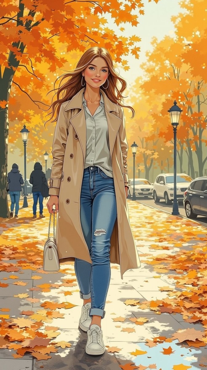 Осеннее настроение в городских парках – это нежность и умиротворение. Эта фотография запечатлевает романтичный момент: девушка в непринужденном стиле наслаждается красотой осеннего дня. Ее образ создан из простых, но стильных вещей: длинный бежевый тренч согревает в прохладную погоду, светлая домашняя блузка добавляет уюта, а джинсы mom fit и белые кроссовки создают расслабленный силуэт. Небольшая сумочка – завершающий штрих в ее повседневном наряде, а аккуратный маникюр подчеркивает внимание к деталям. Мягкие блики света отражаются от влажной земли, создавая ощущение сказочной атмосферы. Задний план украшают золотые листья и теплое освещение, словно согревающие душу. Эффект двойной экспозиции придает снимку особую глубину и загадочность, подчеркивая красоту осенней палитры и романтическое настроение момента. Это история о простоте, красоте и гармонии с природой, рассказанная языком фотографии. Кажется, будто время остановилось, позволяя насладиться каждым мгновением этого волшебного осеннего дня в парке. Идеальное сочетание комфорта и стиля в осенней атмосфере