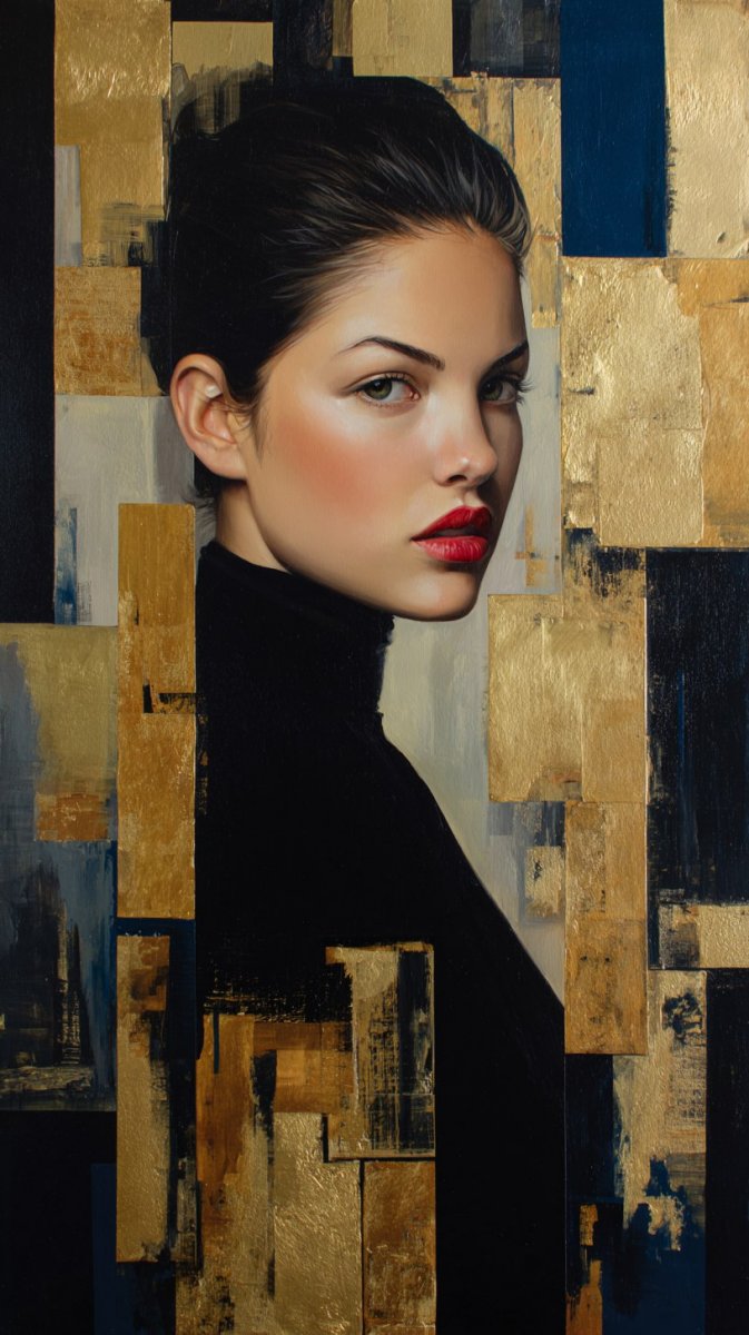Завораживающий портрет современной женщины, воплощающий в себе силу и изящество. Яркие алые губы контрастируют с элегантной прической, собранной в гладкий пучок, создавая образ уверенности и стиля. Фон картины представляет собой глубокое синее полотно с абстрактным городским пейзажем, что добавляет динамики и глубины композиции. Особенностью работы является мозаика из геометрических форм, выполненных в насыщенных оттенках золотого, черного и красного цветов. Эти элементы органично переплетаются, создавая визуальный эффект роскоши и утонченности. Картина излучает атмосферу современной элегантности, подчеркивая независимость и внутреннюю красоту изображенной женщины. Использование вертикального формата 9:16 позволяет максимально раскрыть композицию и акцентировать внимание на деталях портрета, делая его идеальным для современных цифровых платформ и визуальных медиа. Это произведение искусства – не просто изображение, а манифест женственности, силы духа и безупречного вкуса, способный вдохновлять и восхищать зрителя своей глубиной и оригинальностью. В нем гармонично сочетаются классические элементы портретной живописи с современными тенденциями в искусстве, создавая неповторимый визуальный опыт