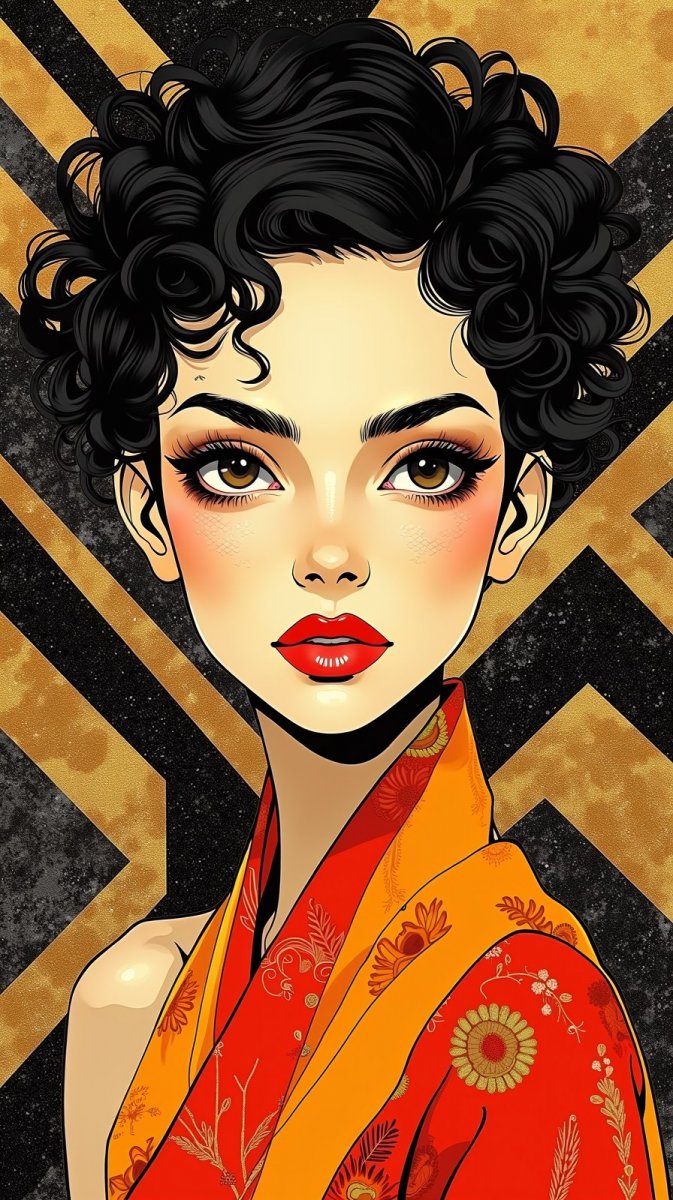Изящный портрет современной женщины, излучающей уверенность и элегантность. Короткие кудрявые волосы обрамляют лицо, на котором запечатлена выразительная, приковывающая взгляд эмоция. Фон представляет собой стильную композицию из черных и золотых геометрических узоров, создающую эффект глубины и многослойности. Яркие акценты оранжевого и красного цвета добавляют динамики и подчеркивают современный характер изображения. Вся работа выполнена в технике пинокллойдж, что придает ей неповторимую текстуру и визуальную насыщенность. Это не просто портрет, а воплощение современной женской силы, стиля и утонченности, способное вдохновить и восхитить зрителя своей гармонией цветов и форм. Каждое детали продумано до мелочей, создавая ощущение роскоши и изысканности. Изображение передает атмосферу уверенного успеха и непоколебимой внутренней красоты, что делает его идеальным для использования в модных журналах или рекламных кампаниях, стремящихся подчеркнуть элегантность и современный стиль. Это визуальное заявление о женской силе и красоте, которое невозможно игнорировать
