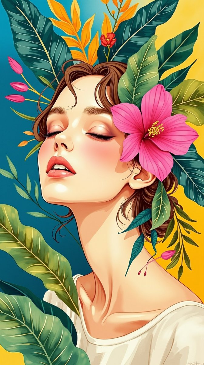 Нежная красота: портрет девушки в тропическом раю цифрового искусства - Пример изображения, созданного ИИ Flux.1