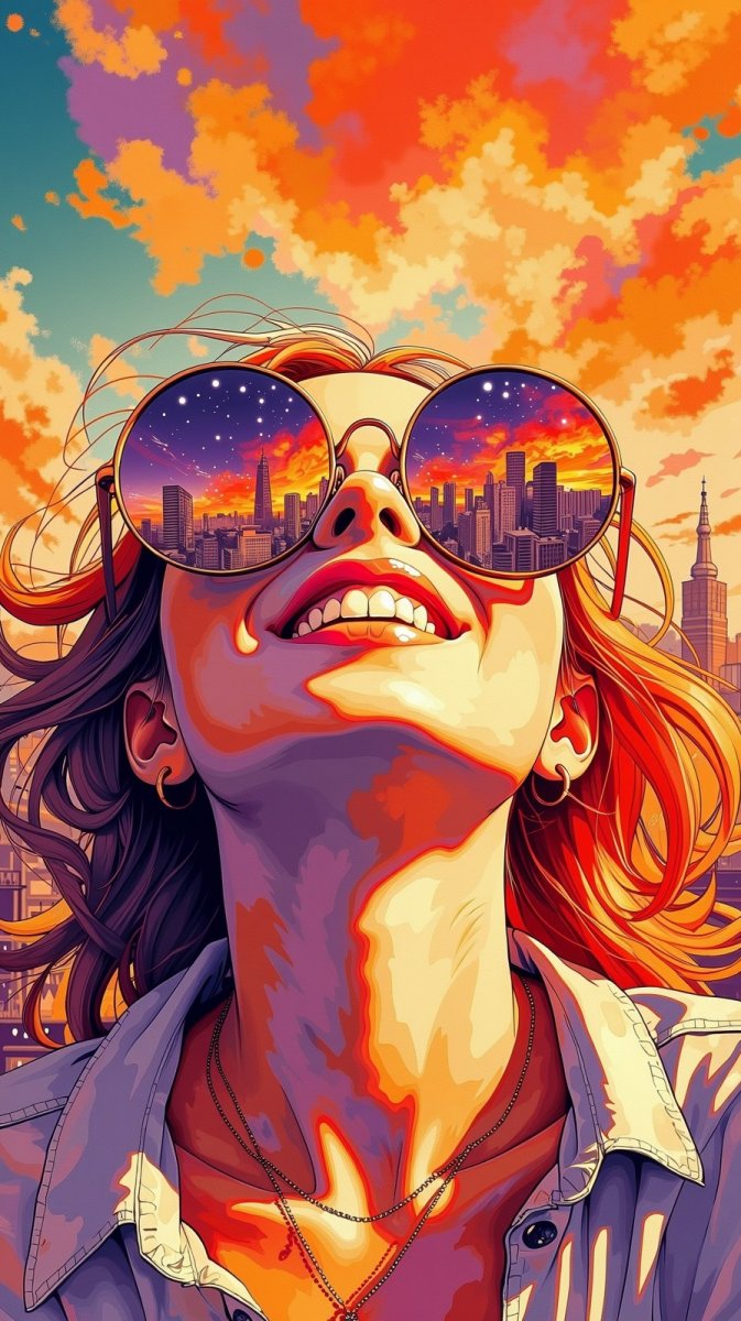 Изящный портрет женщины, устремлённой взглядом к небесам, пленяет своей лёгкостью и беззаботностью. На её лице красуются крупные круглые солнцезащитные очки, в линзах которых отражается панорама оживлённого города, залитого теплыми оттенками заката – огненно-оранжевого и глубокого фиолетового. Выражение лица модели излучает игривость, призывая к радости и предвкушению новых впечатлений. Она словно олицетворяет собой дух свободы и тягу к приключениям, воплощая в себе идеал независимости и уверенности в себе. Это изображение – гимн оптимизму и бесконечному стремлению к новым горизонтам, запечатлённое в мгновении безмятежной красоты. Портрет излучает позитивную энергию и вдохновляет на смелые поступки, напоминая о том, что жизнь полна возможностей для самовыражения и поиска своего пути. Яркие краски и динамичный фон создают ощущение движения и перемен, подчеркивая внутреннюю силу и уверенность героини. Взгляд, направленный вверх, символизирует надежду и веру в лучшее будущее