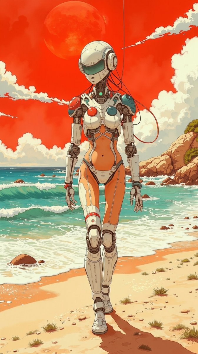 #5. наивное художественное изображение девушки-робота, идущей по галактическому берегу, греющейся под ярко-красным солнцем, украшенной игривым пляжным нарядом, сочетающим в себе элементы научной фантастики и сюрреализма, в стиле Хадзиме Сораямы, #role_sorayama