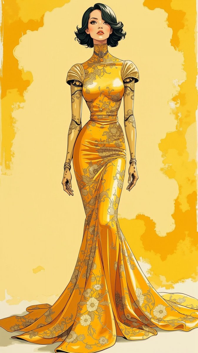 Изящное воплощение футуристической элегантности в стиле ретро. На изображении андроида-женщину, облаченную в струящееся золотое платье с замысловатыми узорами, созданное при помощи гуаши. Четкий, однотонный фон подчеркивает графичность композиции и усиливает ощущение монументальности. Вдохновленный эстетикой комиксов 50-х годов, этот концепт высокой моды сочетает в себе технологическое совершенство и винтажную утонченность. Изображение излучает силу, уверенность и неповторимый шарм, представляя собой современную интерпретацию классических образов. В деталях прослеживается влияние творчества Хаята Сораямы, известного своими работами в области научной фантастики и дизайна роботов, что добавляет изображению дополнительный слой глубины и загадочности. Это произведение искусства демонстрирует гармоничное сочетание аналоговых техник живописи с цифровой эстетикой, создавая визуально захватывающий и запоминающийся образ. Игра света и тени подчеркивает текстуру ткани и придает фигуре объемность. Цветовая палитра выдержана в золотых и нейтральных тонах, что создает атмосферу роскоши и изысканности. Идеальный пример сочетания технологического прогресса и вневременной красоты