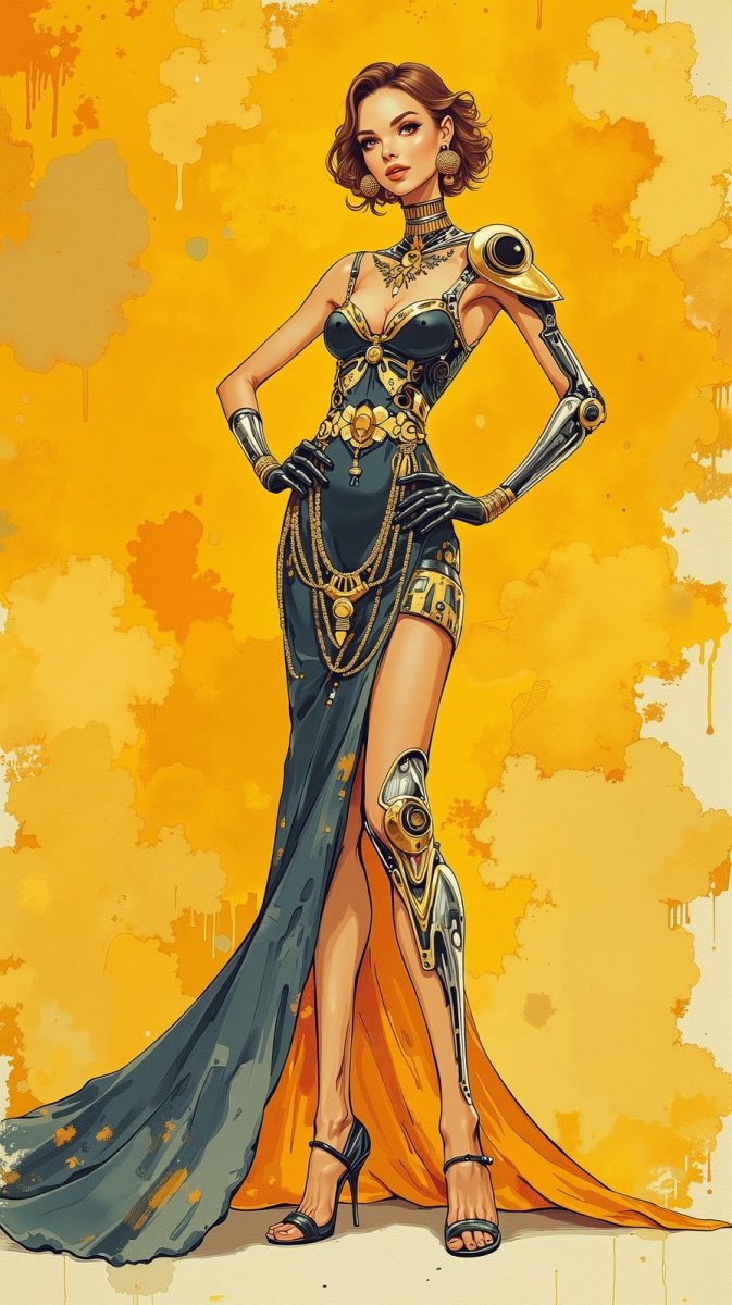 Изящное воплощение цифровой эпохи в традициях народного искусства – завораживающий образ уверенной в себе киборг-женщины. Её силуэт, облачённый в элегантное платье с эффектными хромированными деталями, излучает утончённость и стиль. Массивные золотые украшения подчеркивают её статус и добавляют образу роскоши и монументальности. Поза на одном колене передаёт чувство спокойной силы и внутренней гармонии. Яркий контрастный фон акцентирует внимание на деталях, создавая ощущение живописности и глубины. Эта работа, выполненная в духе народного творчества, сочетает в себе элементы футуризма и традиционного дизайна, воплощая идею симбиоза человека и машины. Композиция излучает уверенность и самодостаточность, демонстрируя красоту и силу современной женщины, способной адаптироваться к любым изменениям. Использование ярких цветов и динамичной композиции делает этот образ запоминающимся и вдохновляющим, а отсылки к творчеству Ёситака Арасоры добавляют работе дополнительный шарм и глубину. Это не просто изображение – это манифест нового поколения, где технологии и красота сливаются воедино, создавая уникальный и неповторимый образ. Вся картина пронизана духом инноваций и эстетической привлекательности