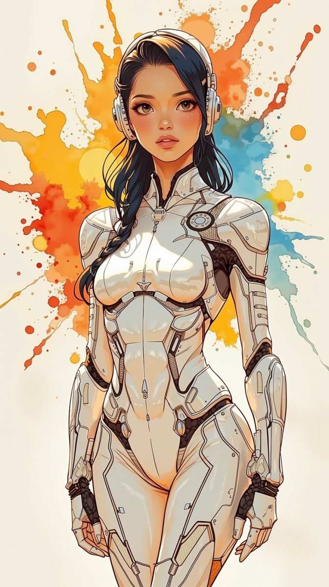 Изящная футуристическая андроида, воплощенная в детальном рисунке тушью, олицетворяет собой смелый взгляд в будущее, вдохновленный эстетикой ретрофутуризма 80-х годов. Её уверенная поза и непоколебимый взгляд выдают силу духа и передовые технологии, заключенные в её совершенной форме. Сложный металлический комбинезон, словно сотканный из жидкого хрома, отражает свет, создавая завораживающий эффект мерцания и подчеркивая футуристическую природу создания. Акценты из полированного металла добавляют образу роскоши и технологической продвинутости, а воздушная техника нанесения краски на заднем плане создает ощущение глубины и динамичности. Вся композиция пронизана духом инноваций и эстетики, характерной для работ Хаяо Сораямы – мастера концептуального дизайна и футуристической моды. Рисунок излучает уверенность, силу и элегантность, представляя собой воплощение идеальной андроидной красоты в мире технологий и стиля. Это не просто изображение, а манифест будущего, где человек и машина сливаются воедино, создавая новую форму совершенства. В нём сочетаются передовые технологии и ностальгия по эстетике прошлого, рождая неповторимый визуальный опыт