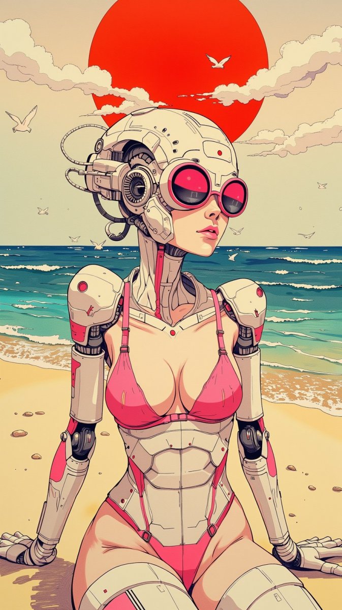 #5. naive art of a biomechanical woman with pink accents, showcasing exquisite details while lounging under a bright red sun, evoking a dreamy seaside atmosphere infused with sci-fi elements. #role_sorayama