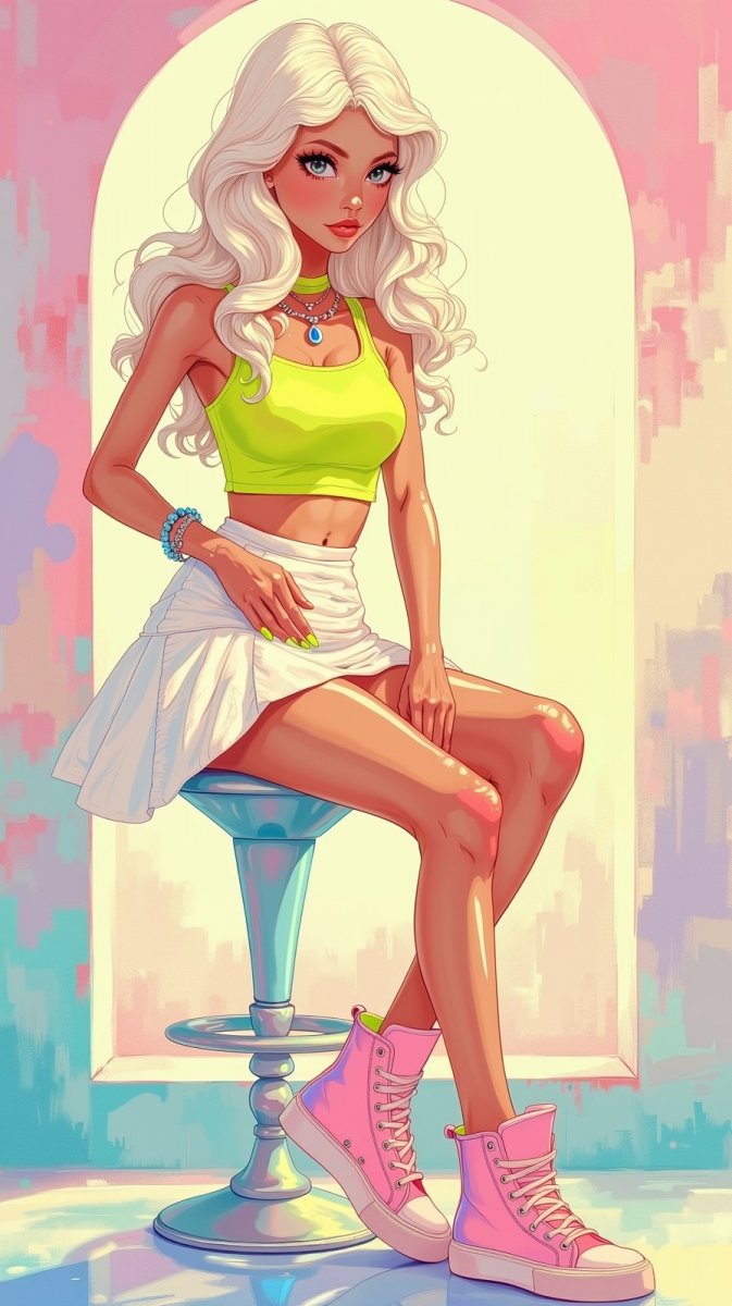 #1 a chic bimbo girl, platinum blonde hair styled in soft waves, sits elegantly on a pastel barstool with her legs crossed. she's wearing a luminous white skirt, a neon lime crop-top glowing subtly, with pastel pink high-top sneakers featuring tiny neon details. softly lit pastel gradients in the background create a cozy urban vibe, while her hands rest naturally on her lap, showcasing perfectly manicured neon lime nails. calm gaze, relaxed posture, serene fashion aesthetic. #role_blonde_2