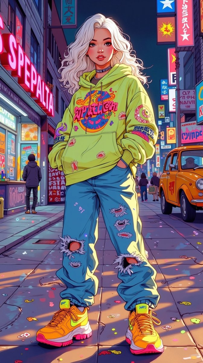 #1. a trendy streetwear girl, platinum blonde hair styled in soft waves, is confidently standing on a bustling neon-lit street corner. she wears an oversized neon hoodie with colorful graffiti patterns, baggy jeans with neon accents, and bright chunky sneakers. her hands are casually tucked into her pockets, showcasing bold neon nails. the background is filled with vibrant street art and glimmering city lights, creating an energetic yet laid-back atmosphere, natural pose, serene smile, relaxed vibe. #sp_moda