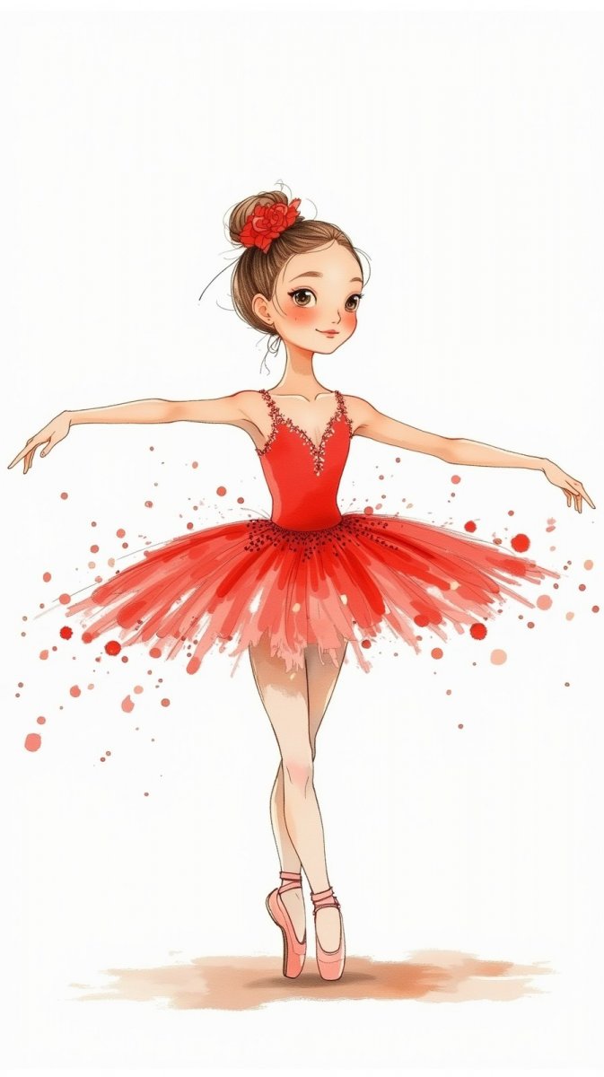 №5. наивное искусство балерины, одетой в яркую красную пачку, в середине выступления с согнутыми ногами и вытянутыми руками, голова повернута в сторону, волосы собраны в пучок с ярким красным цветком, мягкая улыбка на лице, фон белый #role_dance