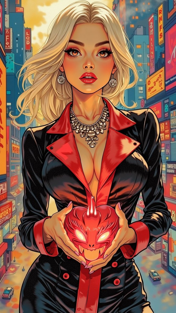#5. professional photo, sexy blonde in a black and red jumpsuit, against the backdrop of a colorful cityscape. Bright red lips, a statement necklace and black false eyelashes. In your hands is a bright demonic heart, with an atmosphere of romance and mystery. #role_real