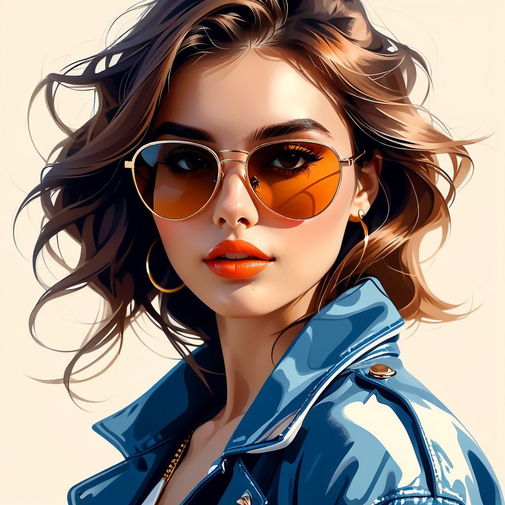 На изображении, созданном с помощью нейросети Stable Diffusion и модели DreamFusion, представлен портрет молодой женщины, выполненный в стиле иллюстрации. Картина акцентирует внимание на деталях её стильного образа: модная одежда и солнцезащитные очки придают образу загадочность и уверенность. Выражение лица передаёт черты характера 'цундэрэ' – сочетание внешней холодности и скрытой теплоты, добавляя портрету глубины и многогранности.
