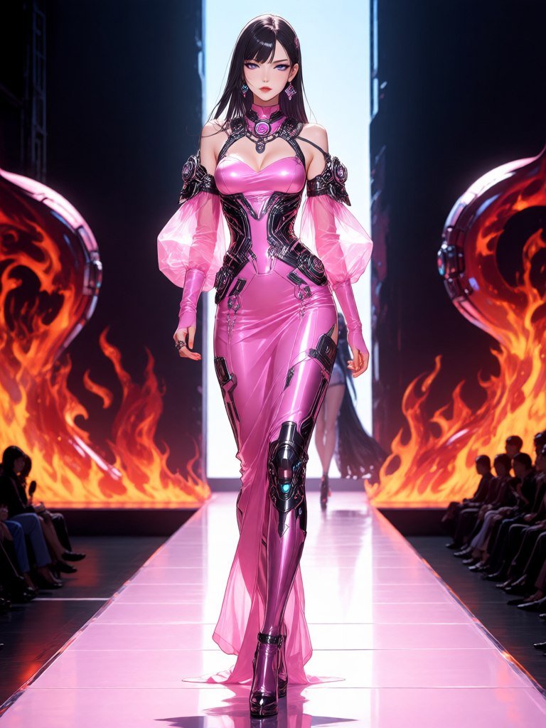 <lora:1914845:1.0>, anime, illustration, fashion-forward female in a pink dress, futuristic biopunk elements, walking down a runway in hell with abstract shapes, digital art capturing high fashion, elegant model posing confidently with a striking look.